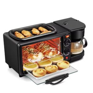3-in-1 Breakfast Station – A multifunctional appliance with a toaster oven, coffee maker, and non-stick griddle, designed to prepare a complete breakfast in one compact unit.
