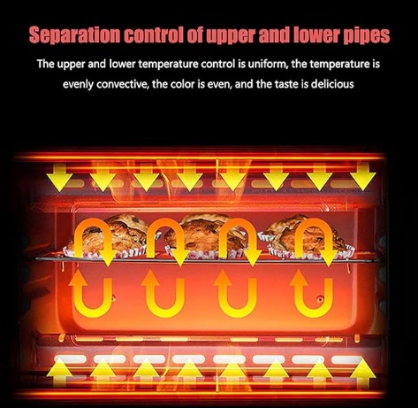 ✔ Even Heating (image shows convection arrows) – Separate control for upper and lower heating pipes ensures uniform cooking results.