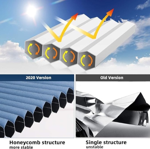 Honeycomb Structure (image comparison) – More stable and effective at reflecting sunlight compared to single-layer foil shades.