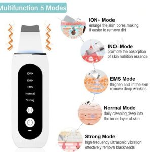 Multifunction Ultrasonic Skin Scrubber – A 5-mode facial device designed to deeply cleanse, lift, and rejuvenate your skin using ultrasonic vibration and ion technology.
