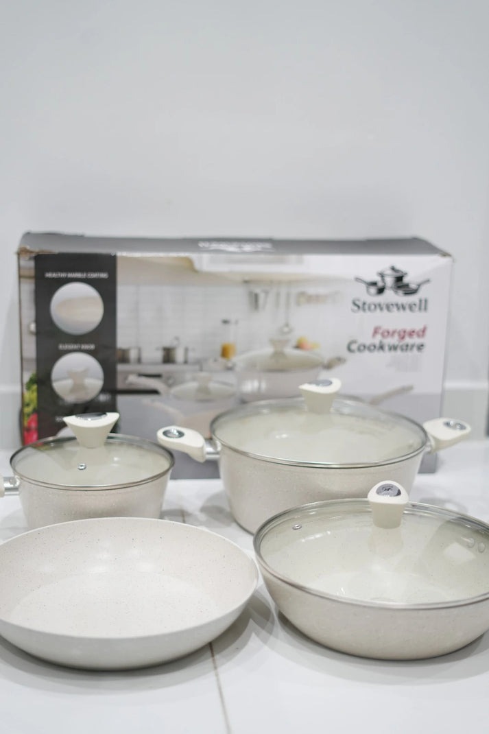 Experience effortless cooking with the Stovewell Cookware Set 7pcs, crafted with durable forged aluminium and a premium marble non-stick coating. This elegant set includes all your kitchen essentials